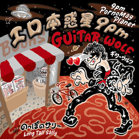 A lot of japanese Rock'n roll fan's really look up to Guitar Wolf. They are Rock'n roll heroes in existence. They are special to us like no other. They have been making a lot of legends and playing sound the impulse as always from 90s. Their music is very extreme and very loud; just like Rock'n roll should be. Seiji's lyrics have a sense of individual humor and evoked a sense of "Galaxy" & "The Showa". The three guys cover themselves with a black leather that their sound is the same as a long time ago. They are always prusuing their style. Their perseverence had an effect on each others. Guitar Wolf has always pushed forward, beyond the boundaries of any one-dimensional rock trio. They will go on increasing Guitar wolf avid fans all over the world. Guitar Wolf were formed in 1987. Originally formed by Seiji and Billy (Bass,Vo). After that, Toru has joined Guitar Wolf. Goner Records(independent label based in US,Memphis)released "Wolf Rock",Guitar Wolf's debut LP, in 1993. After that,they signed up a contract with "Matador Records"(A Representative independent label of US) In 1997,They debuted with a major label " Ki/oon Records" in Japan. And, they released "狼惑星" at the same time. Guitar Wolf has released 12 albums to this day. And,they played not only Japan but also US,EU,AUS and Southern America. They work on a worldwide level. In 2005, Billy died. Almighty U.G and Hikart had joined Guter Wolf. After then, GOTZ is new menber in 2018. In 2022,11th March,Toru left.